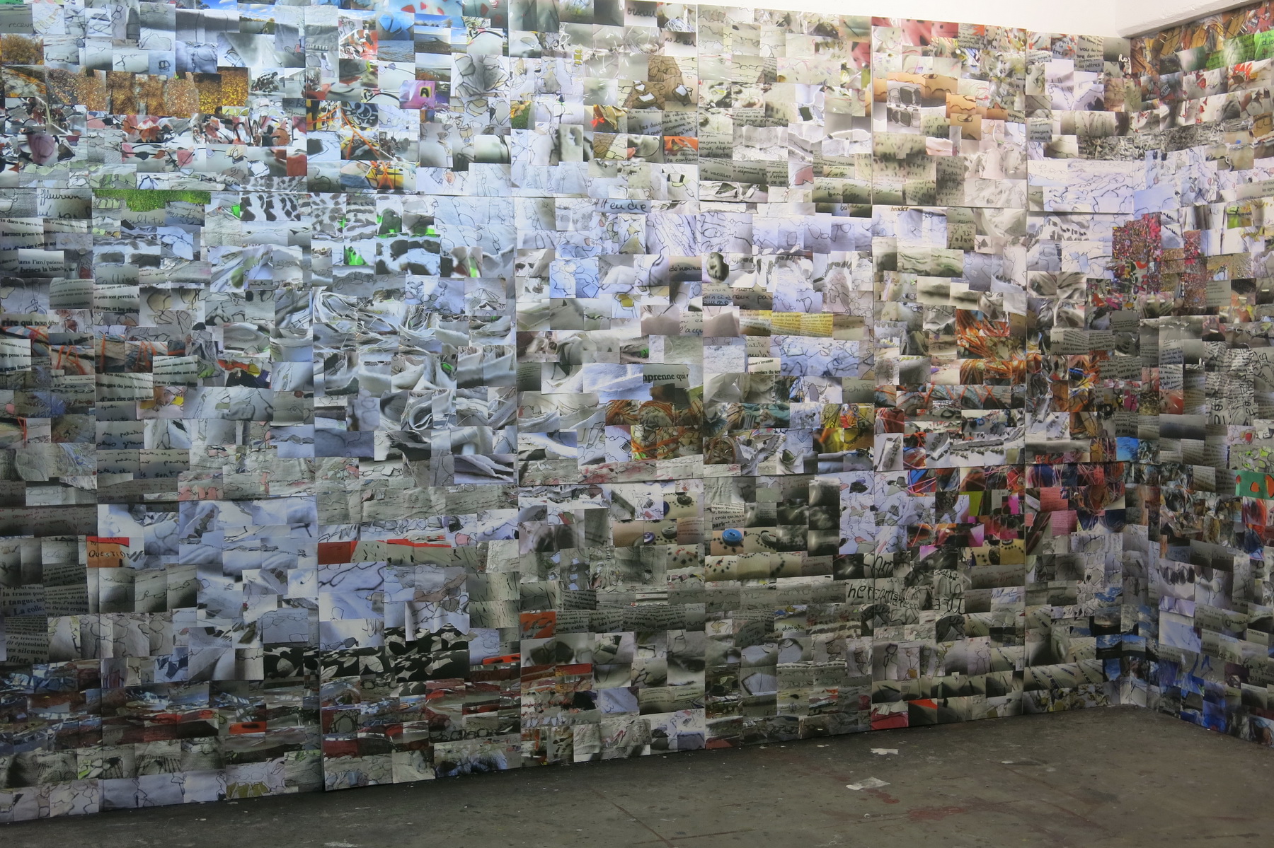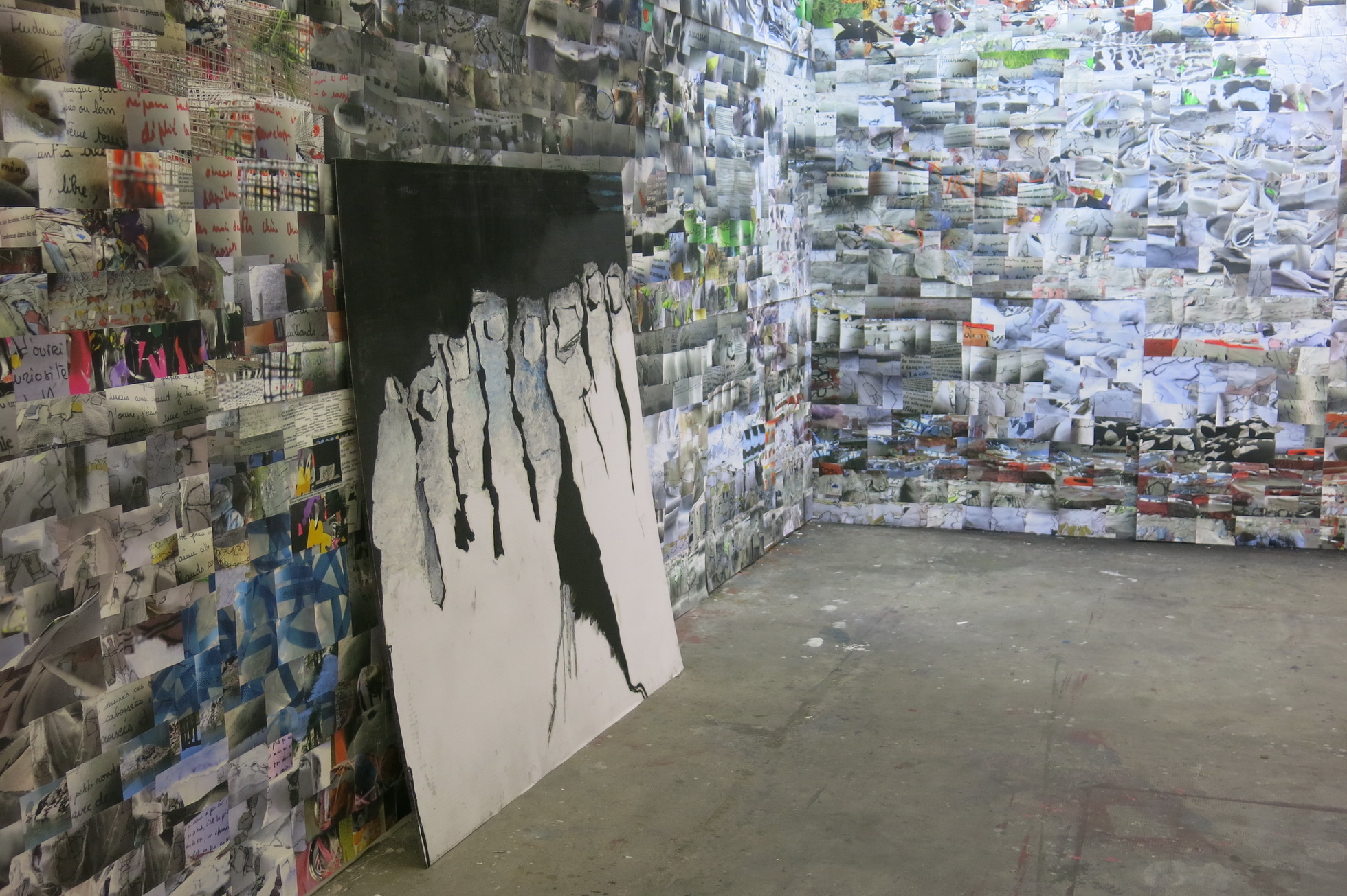 Au Canada, Christine Delbecq avait commencé à prendre en photo des détails des courriers qu’elle faisait ou recevait. Ces images, découpées, collées aux murs des couloirs du lycée où elle était accueillie, formaient peu à peu un long chemin. En Bourgogne, dans son atelier, elle a repris l’idée, mais en la poussant à son maximum! Tout garnir les murs!