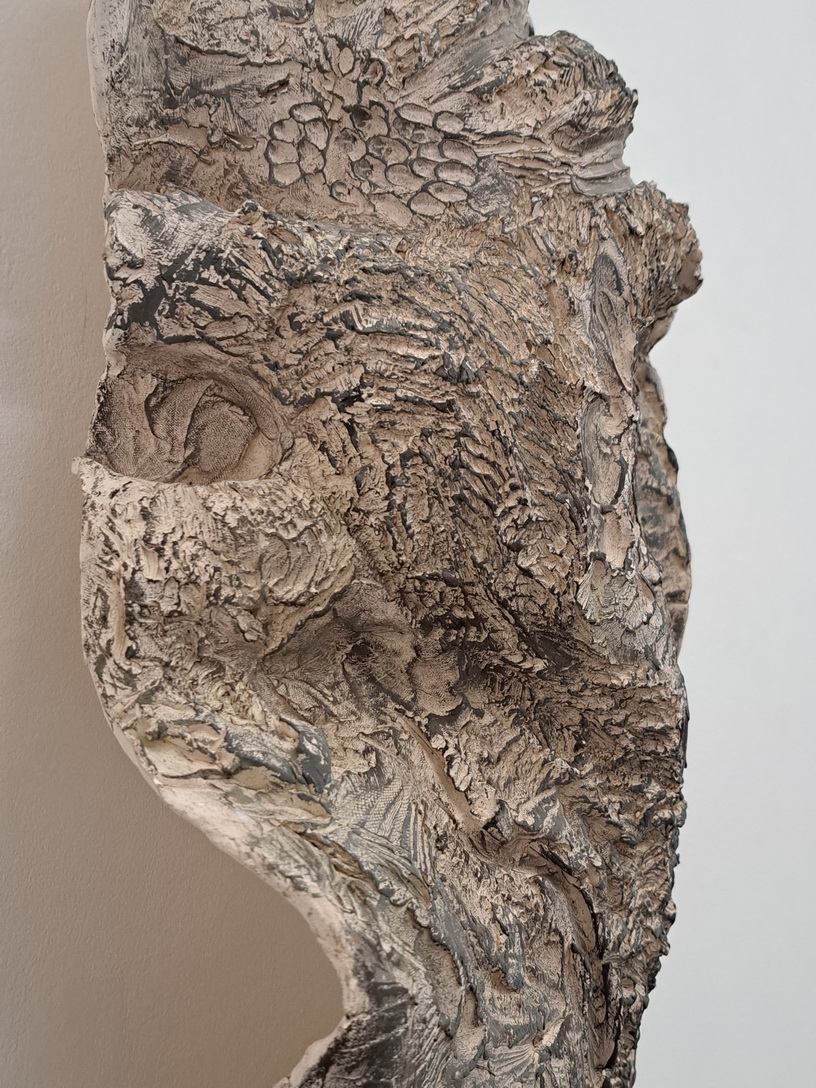 Marine Chaleron épuise le sujet « terre »: on devine au travers de son travail toutes les étapes, toutes les phases par lesquelles cette matière peut passer (La terre étant déjà en elle-même un livre d’Histoire! Et voilà qu’elle est utilisée par l’artiste et qu’une autre vie , d’autres vies l’attendent!). Malaxée, plissée, tordues, cuite, brûlée, cassée, refroidie, peinte, vernie, gravée…Exposée dans une Galerie d’art!