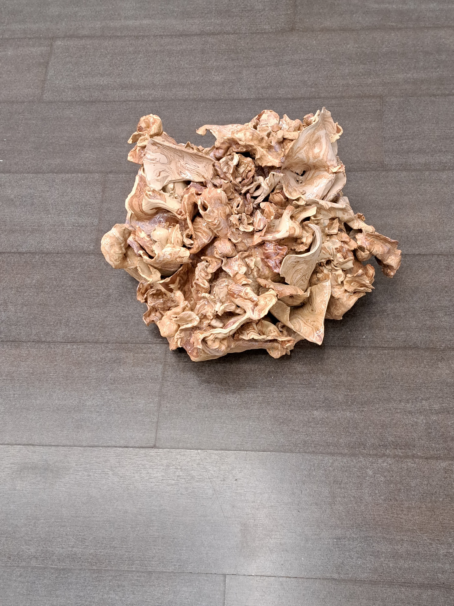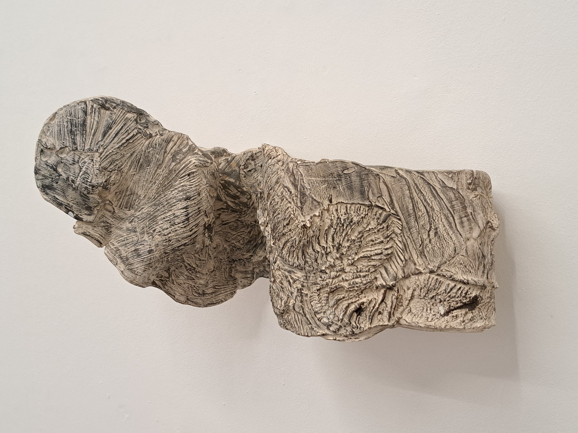 La scénographie m’a parue bien faite. Premier hall: quelques pièces sophistiquées, brillantes, faites de mille morceaux assemblés, comme de gros bijoux, avec des détails à examiner de près. Deuxième hall: des fragments de terre cuite brute, avec empreintes et traces « archéologiques », posés au mur, espacés les uns des autres. Et, entre les deux, une pièce qu’on aurait pu jeter, car ratée, éclatée, explosée… mais que l’artiste a récupérée pour lui donner sa chance d’œuvre d’art! Et c’est beau!