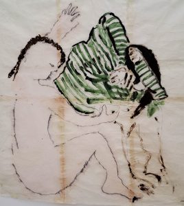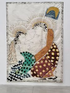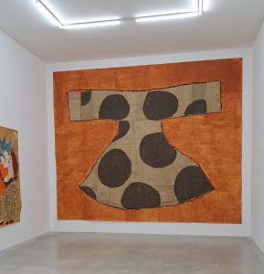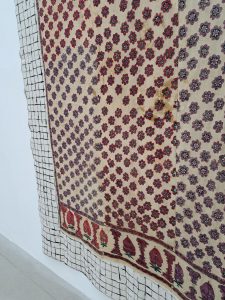 On évoquerait volontiers des patrons géants de couturières. Beaucoup sont des kimonos. Et ici tout est matière, le support comme le motif. La matière est le sujet principal du travail d’Isabella Ducrot. Matières précieuses car souvent anciennes et venues des 4 coins du monde, collectionnées lors de ses voyages , chargées d’histoire. Elles ont déjà vécu plusieurs vies. Elles ont vielli. Tachées, décolorées, usées, rapiécées…mais toujours vivantes. Plus que jamais.