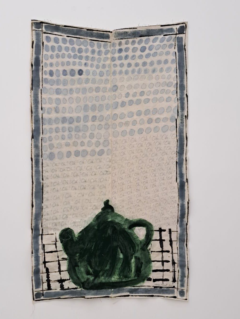 Quelques traits tracent des scènes de tendresse, des vases de fleurs, une théière… Minimaliste. Beaucoup de motifs de « pastilles » (comme Yayoi Kusama?). Répétitif. Un motif à l’encre revient aussi comme un leitmotiv chez Isabella Ducrot: une sorte de canevas noir et blanc, un grillage dessiné à main levée qui encadre souvent les oeuvres. Les éléments répétitifs, après les matières, semblent constituer l’essence du travail de cette artiste.