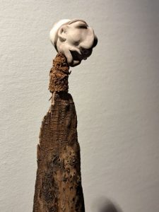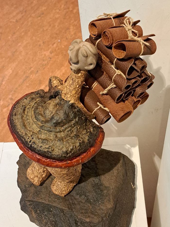 Comme Maria Manuela, elle assemble des morceaux. Une touche-à-tout! Papier, filasse, champignons, courges, bois, terre, tissus, cuir, grès… Quand les trouvailles de sa quête sont insuffisantes, elle fabrique elle-même. Et ses petits êtres ne ressemblent à rien! Et c’est tant mieux! Entre ex-voto et statuettes magiques. Ils pourraient être les santons d’une crêche universelle, au-delà de toutes les croyances…