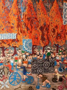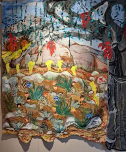 Maria Manuela, déjà vue une année précédente (mais vite fait et dans de mauvaises conditions) à l’exposition d’Itinéraires Singuliers à St-Philibert, m’a passionnée par le foisonnement formidablement créatif de ses oeuvres. Sur de grands textiles, elle peint, brode, tisse, colle … Et ce sont alors des brouhahas de couleurs, de personnages, de végétaux, de paysages, d’animaux qui vous embarquent dans d’invraisemblables récits!