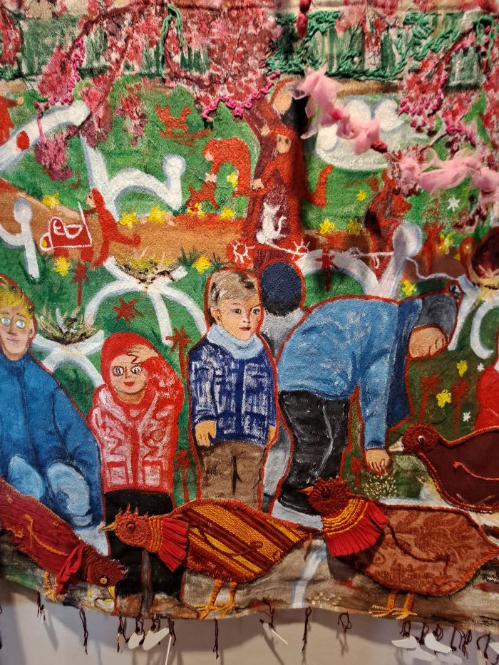 Maria Manuela, déjà vue une année précédente (mais vite fait et dans de mauvaises conditions) à l’exposition d’Itinéraires Singuliers à St-Philibert, m’a passionnée par le foisonnement formidablement créatif de ses oeuvres. Sur de grands textiles, elle peint, brode, tisse, colle … Et ce sont alors des brouhahas de couleurs, de personnages, de végétaux, de paysages, d’animaux qui vous embarquent dans d’invraisemblables récits!