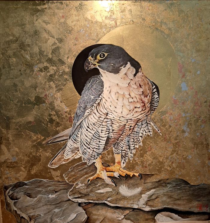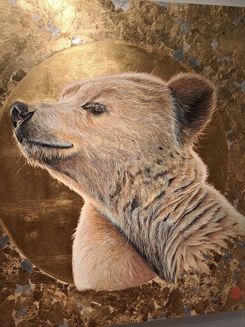 Derrière son ours ou son aigle, je sens d’abord une grande sensibilité artistique, et, en plus, une solide expérience des arts graphiques. Au service de sa peinture animalière, elle met tout un savoir-faire qui va de l’enluminure à la calligrahie, en passant par la miniature et la restauration à la feuille d’or (restauration des biens culturels, en particulier d’oeuvres graphiques). C’est cette richesse cachée qui fait que l’on s’arrête devant ses tableaux, happés par une étrange impression