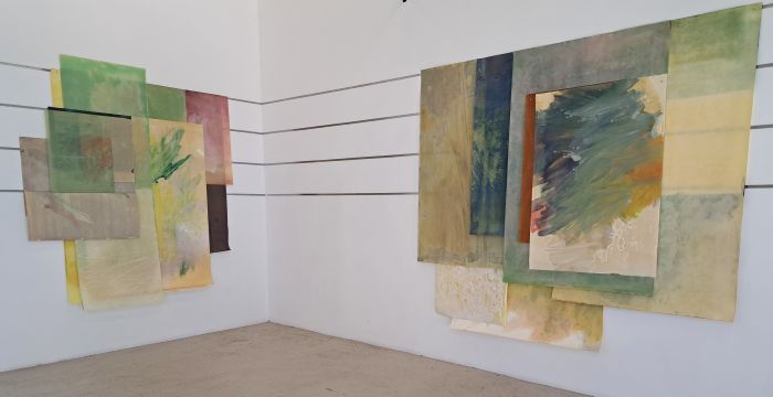Ses dessins et peintures ont une discretion, une modestie, une simplicité apparentes qui ne nous en mettent pas plein la vue. Rien de spectaculaire. Tant mieux. Ce sont des feuilles de papier (ou de toile) assemblées, parfois superposées, parfois enroulées. Elles sont peintes. La palette est plutôt douce, à tendance jaune et verte, avec mille nuances et quelques pas de côté vers des rouges orangés. Le geste pictural de l’artiste est là: court, volontaire, énergique.
