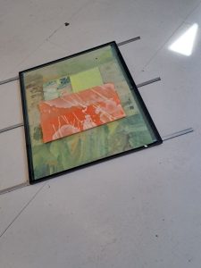 Au mur ou au sol, ces feuilles colorées s’offrent comme des livres à feuilleter du regard. Ou comme des manuscrits anciens à effleurer des yeux respectueusement. Les différentes épaisseurs et matières créent la variété et les transparences. Un côté géométrique et « rangé » de ces assemblages nous rassure en quelque sorte: on suit des lignes (bien marquées par des baguettes métalliques). C’est encore une façon de nous guider.