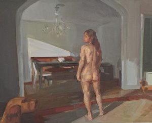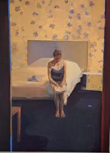 On est tentés d’évoquer Edward Hooper dans ce qu’il y a de silence, de secret et presque d’irréel dans les scènes peintes par Dagmar Cyrulla. Quelque chose s’est arrêté. Est-ce à cause de notre regard indiscret? Le temps s’est figé. Les mouvements et les gestes sont stoppés dans leur élan.