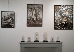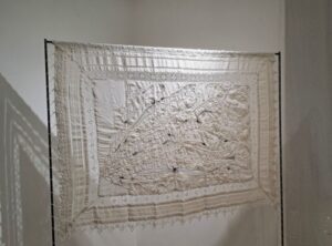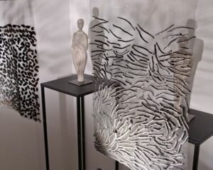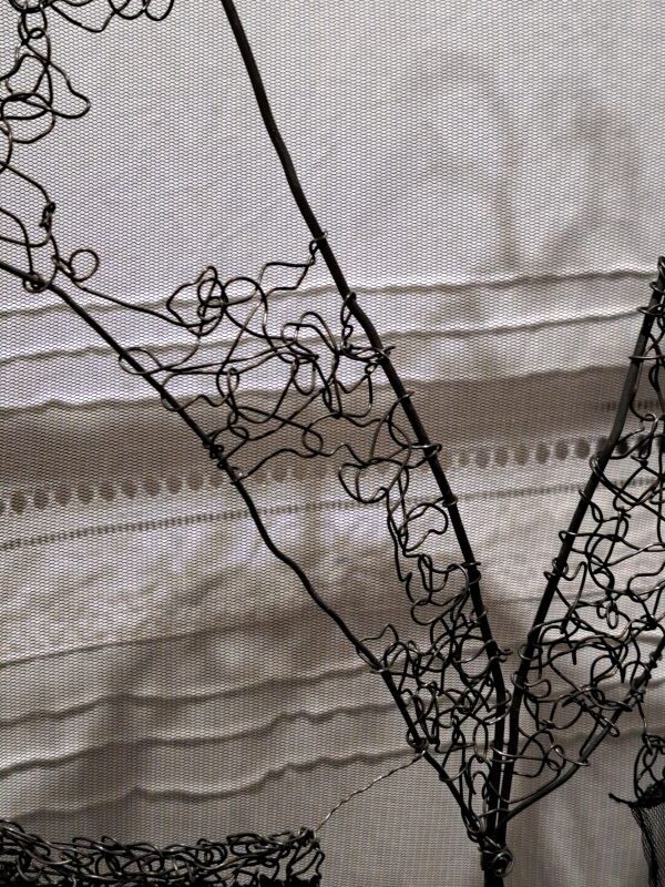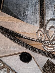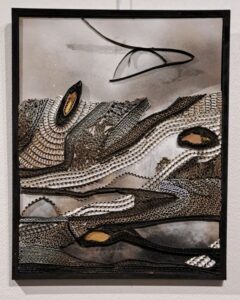 Et Francis Orzel, autre artiste plasticien, se glisse dans ce monde-là avec une aisance étonnante, lui qui, depuis quelques années, est dans une recherche inlassable sur le carton ondulé. Ses tableaux donnent à voir des paysages improbables, profonds, harmonieux, mouvants, transparents … Et, ici, il rejoint les dentelles et broderies de Michèle Millerot.