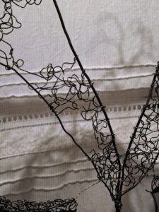De son travail de plasticienne sur les tissus anciens et sur tous les napperons, linges, accessoirs et habits du passé, Michèle Millerot passe à une réflexion sur l’écoulement du temps, sur la mémoire, sur les souvenirs familiaux, les liens entre générations. Une douce nostalgie. Les installations comportent des objets, des photos, des écrits, des personnages en silhouettes …