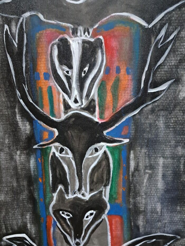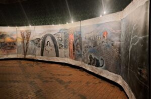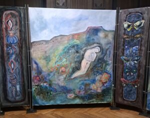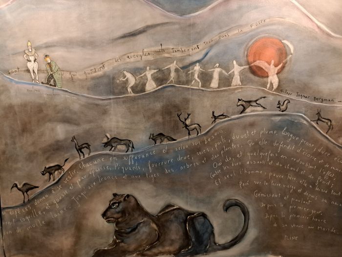 Et puis, il y a la seconde salle. Celles des boiseries. Même scénographie grandiose. Séance de chamanisme ! On s’enfonce un peu plus profond dans la mémoire et le ressenti personnel! Impressionnant ! Totems, animaux fétiches, passages de la vie à la mort… Des scènes représentées émane une forte émotion.